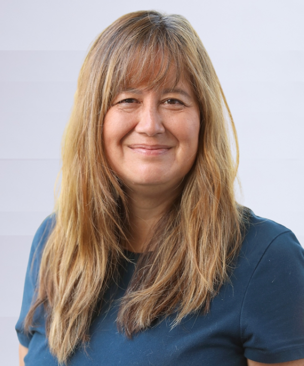 Portrait of Jen Soalt, with a smile, shoulder-length brown hair, a sky blue jacket, and a blurred white background.
